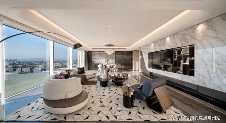建面约330㎡皎玉湖畔,戴昆先生从玉湖中汲取设计灵感,以曲线模仿流水的幻化无穷,以劳伦黑金、芬迪白等奢石转译新石器时代的色彩意象,用空间撰写灵动而深邃的人文诗章。巨幕转角大边厅,营造双面环景视野,将中央园景尽收眼底。