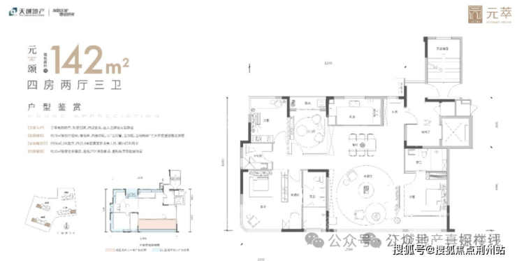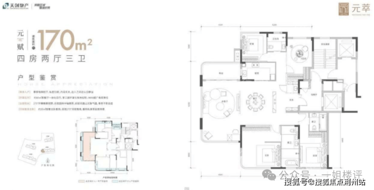 最大面积的是建面约172平的四房两厅三卫大平层: