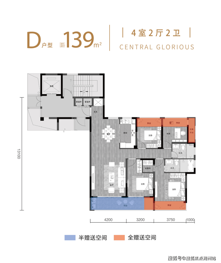三室两厅两卫,赠送约13.9㎡:主卧带独立衣帽间和卫生间,宽约6.6米南向阳台,兼顾功能和享受,约32㎡餐客厅空间,带约6.3米大飘窗,通透性与尺度感俱佳。