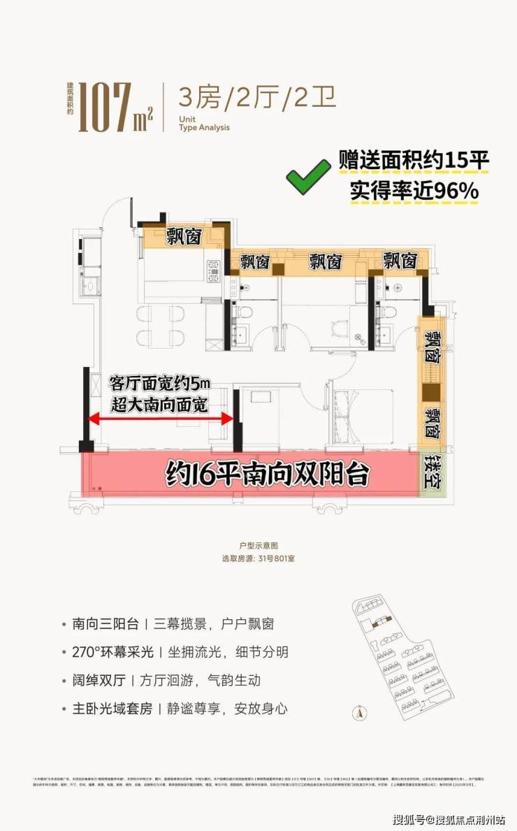 南向2个大阳台+飘窗附赠+电梯厅延伸空间,赠送面积约15m²,实得率约96%。