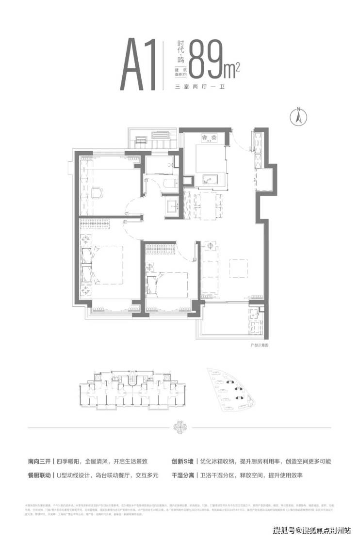 建面约89m²三房两厅一卫户型,LDKB一体化设计,南向三开间布局,全明空间设计。让四季流转于生活之中,用自然营造生活的惬意。
