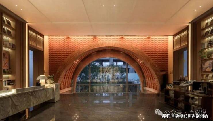 再进来是社区大堂,映入眼帘的是一个教堂式的英国建筑风格的大拱券,圆弧状的大玻璃,把下沉庭院的景观展现在你面前,这是一幅大型山水的画卷,一眼万年,严肃庄重。
