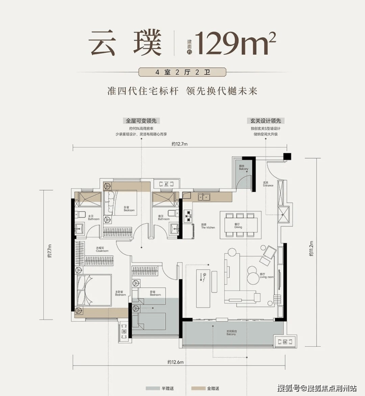 4号楼总高34层,一个单元,2梯4户,包含建面约103-129平房源