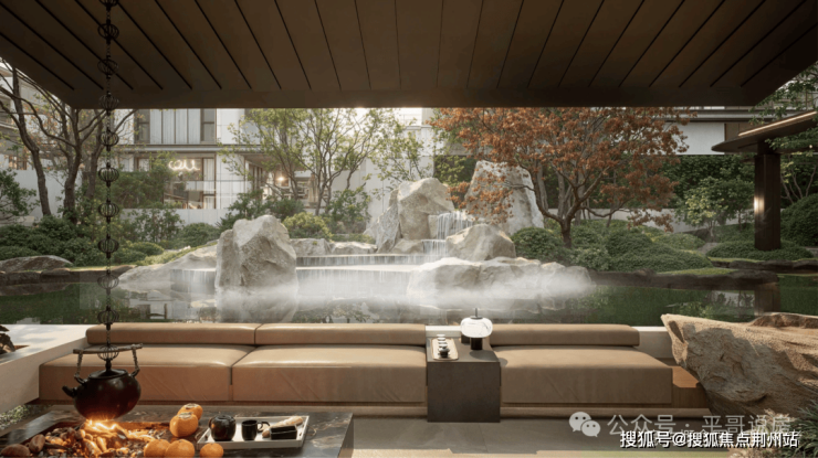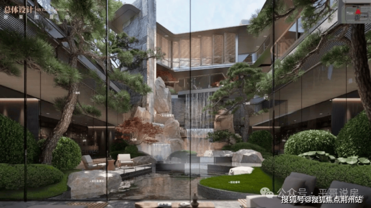 ✅景观中庭的设计是市面上极为少见的三层观景式设计,以北宋画家范宽的《溪山行旅图》为范本,叠石、壑松及高低落差约15米飞瀑,亭台楼阁、檐下的游廊、小桥流水相互映衬,宛如一幅山水画卷。