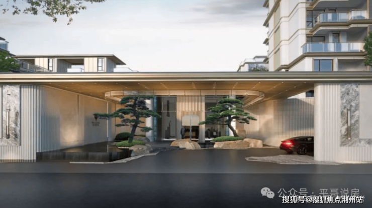 ✅项目以东方宋韵与现代艺术相融合为设计理念,入户门厅采用引园入院的手法,门前水流透过景墙、两侧相迎的黑松以及铜元素入户大门的设计,让归家之路更具尊贵仪式感。