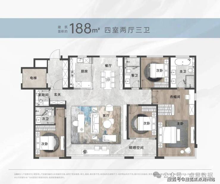 约188㎡的户型四室两厅三卫的设计,南向采光达17.5米,客厅采用7.2米大开间客餐一体宽厅设计,带来了视觉上的层次感和生活上的无限可能。