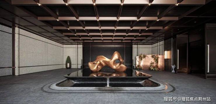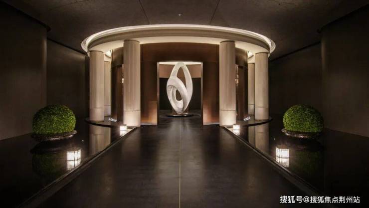 整块安哥拉黑石打造的中心水台呼应珠江水脉,致敬亨利・摩尔的《鎏金雅韵》雕塑,让西方流线雕塑与东方写意气韵,在入口层面完成第一次极致对话。