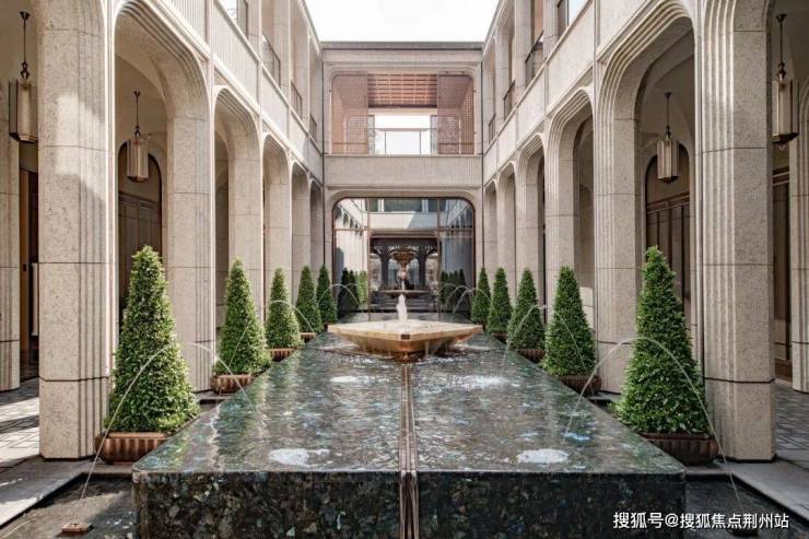 音泉光厅的登场,则是整座会所最具综合张力的章节。11.5 米高的双层廊柱,提炼自阿尔罕布拉宫的空间语汇,又融入广府冷巷的尺度智慧;18 米叠级水景,延续卡洛・斯卡帕层级分明、节点精准、以水为序、让秩序与诗意共生的秩序哲学,赋予空间流动的节奏感;古罗马十字拱与经典柱廊并置,让西班牙、瑞士、古罗马与广府四大文明历史语境在同一屋檐下自然叠合。