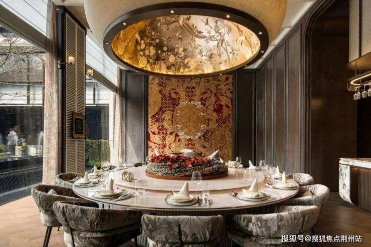 私宴厅,更像一座可触摸的工艺博物馆。头顶是粤绣“屏开富贵”转译而来的主吊灯,288片金箔手工贴附,把晚清的细腻针脚悬停在半空;背后是《甲第艺术墙》,非遗木雕鎏金工艺,大漆为底、螺钿为嵌,让岭南花窗的轴镂空与欧式穹顶的弧线在墙面上镜像重叠;手边是手工烧制的朱砂红琉璃砖,与宝格丽紫大理石吧台轻轻对撞。岭南鎏金、粤绣贴箔、广府琉璃,这些原本散落在不同时空的工艺,在这里被重新编排,叠合成一种东韵西境的当代质地。