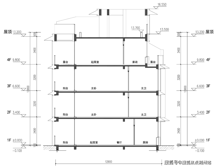 我以前一直不建议买叠拼,原因就是开间太小,但现在的叠拼基本解决了这个问题。这次姚江润园的叠拼,开间来到了约11.5米,客厅开间约7.7米。包括他的层高,也比以往的叠拼要高,下叠首层层高约3.4米,二层约3.2米。上叠因为做了倒置处理,所以是二层约3.4米,一层约3.2米(下图)。这个自己理解一下,是现在很流行的做法,避免了业主去顶楼露台还需要经过卧室区的问题。所以说,现代叠拼的空间尺度感是拉满的,完全配得上“墅”的说法。