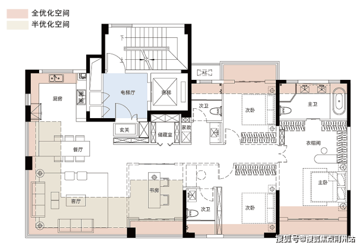 这种设计少量出现在豪宅的顶层,比如武昌内环滨江550㎡的产品,更常见的是由一个业主同时拿下两户,实现一层一户。