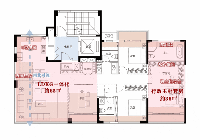 整个户型的把动区集中布局,用厨、餐、客形成了一个完整的模块,这块面积接近50㎡。