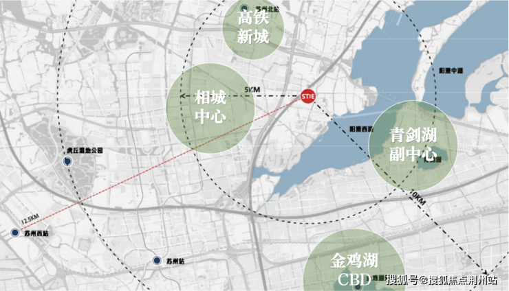 向北为高铁新城、向东为园区青剑湖副中心、向西为相城元和中心、向南为金鸡湖CBD。