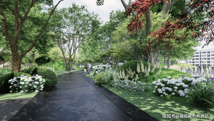 住区景观以浮岛度假泳池围合中央空间,将五重植被景观递进串联,人文活力主题架空层与泳池上方的光岛图书馆遥相对望,集合阅览、休息、嬉水娱乐、养生为一体的第二生活活力空间,容纳生活的百般志趣。