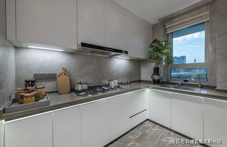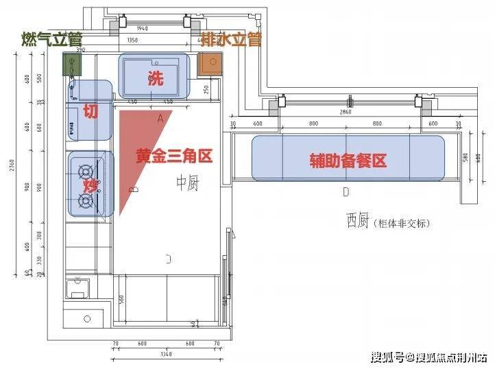 这个区域俗称“厨房黄金三角区”,洗好的各种食材,要在此摆上菜板切、剁,再去灶台烹饪。而只留下煤气立管,则是尽最大可能留下台面空间。