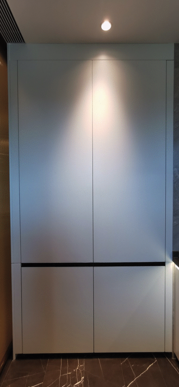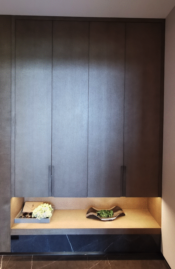 一整面墙的玄关柜,充分利用有效空间。内部还配置了一台衣物护理机。尤其是新冠疫情下,可对外出归家的衣物第一时间进行消毒处理。
