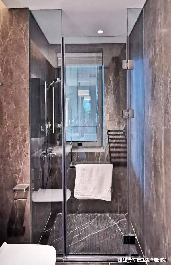 淋浴屏风是定制的,通高一直顶到吊顶上。这种处理,通常只出现在五星级酒店里,很少会应用在精装房中。