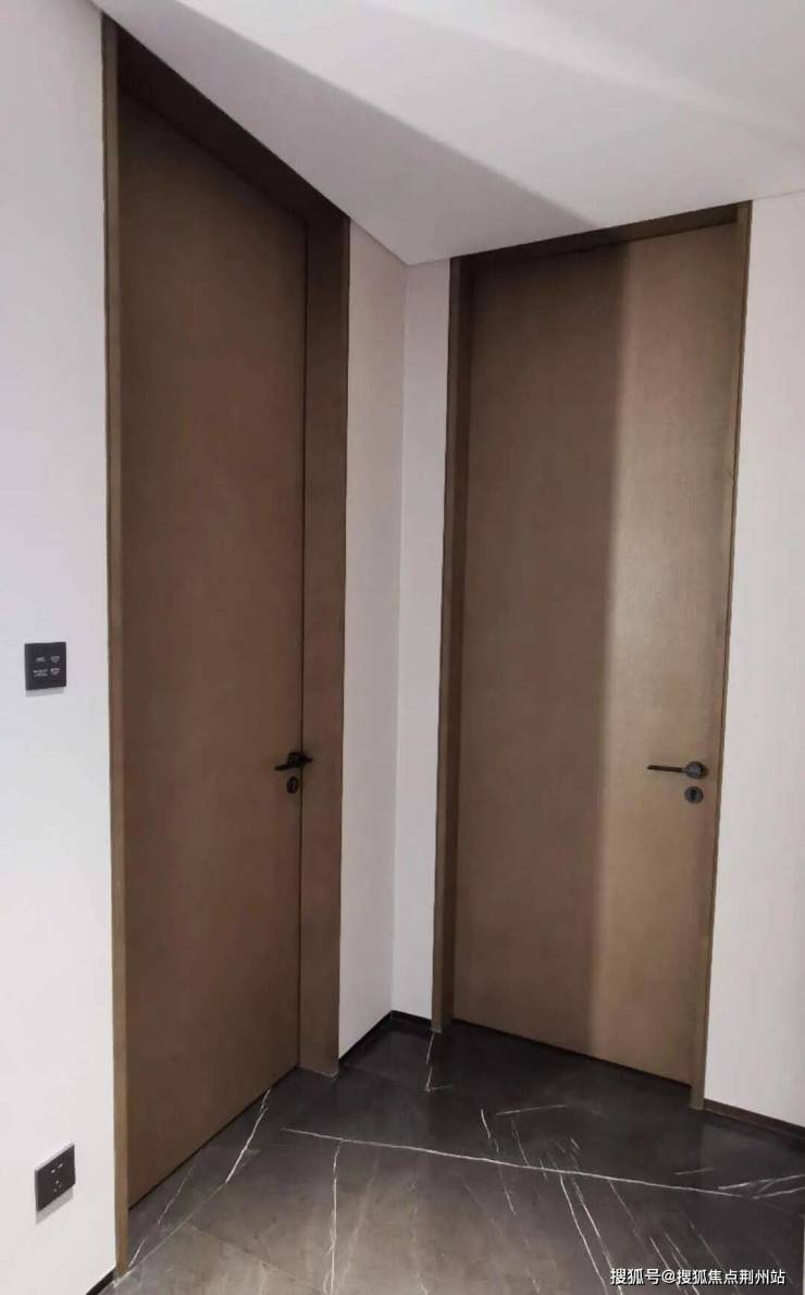 所有户内门也做成通高门洞,与吊顶相交,拉伸了室内纵向空间。木门颜色与护墙板、木作柜体一致,外部实木贴皮内部实木框架。