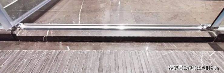 淋浴房地面石材开槽防滑,四周开导流槽方便排水。隐藏式地漏正好位于淋浴房正中,表明基础建筑施工时、下水口的尺寸就留得恰到好处。