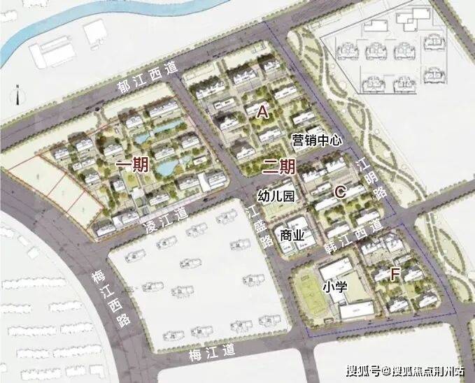 二期包含A、C、F三个住宅子地块,幼儿园、商业、小学均位于江盛路沿线。