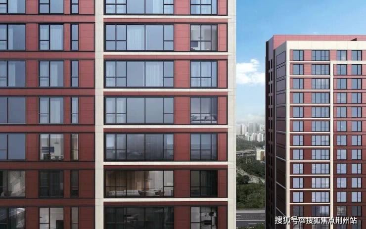 基座干挂温莎米黄石材,主体干挂红色陶板幕墙,并以香槟银金属铝板线条勾勒出腰线,搭配落地系统窗,洋房还有陶瓦和铝板屋檐组成坡屋顶……