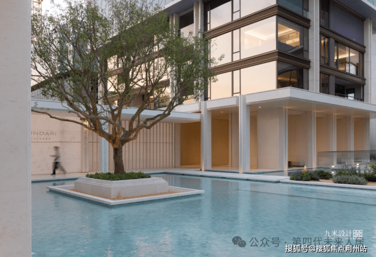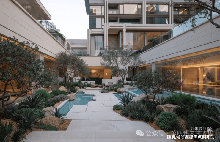 项目以地中海风情打造实景,以“温暖极简主义”为底色,蓝白配色居多,让项目呈现出了更为年轻、焕然一新的清新气质,让人眼前一亮。地中海风格在板块内辨识度极高,蓝宝石铺底的中心水院、老桩油橄榄、莱姆石,为社区增添清新与灵动;约3米宽风雨连廊,实现“无风雨归家”,一步一景。