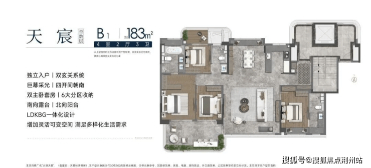洋房B1户型建面约183㎡,4房2厅3卫,四开间朝南,双主卧套房,六大分区,LDKBG一体化设计,满足多样化生活需求。