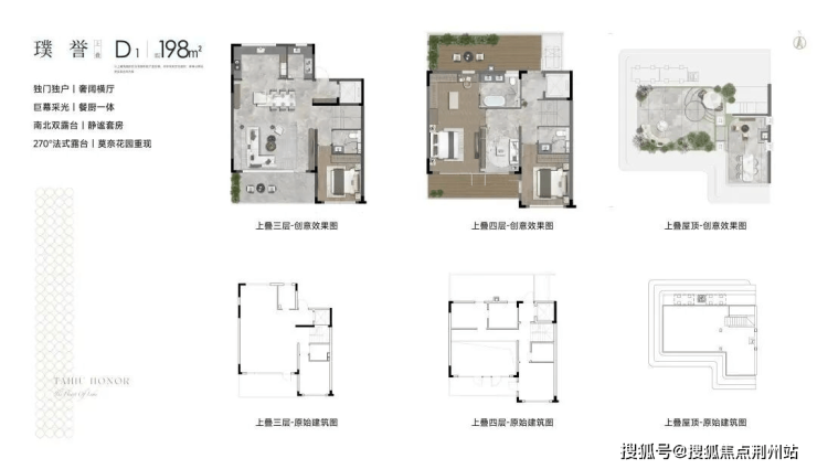 叠墅上叠建面约198㎡,独门独户,拥有奢阔横厅,餐厨一体,南北双露台,更有270°法式露台,可打造莫奈花园。