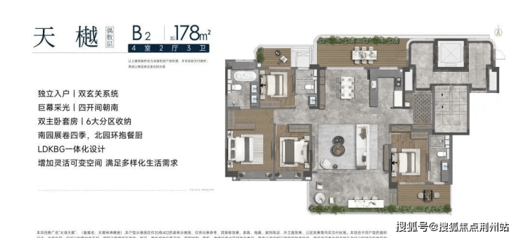 洋房B2户型建面约178㎡,4房2厅3卫,四开间朝南,拥有巨幕采光,南园展卷四季,北园环抱餐厨。