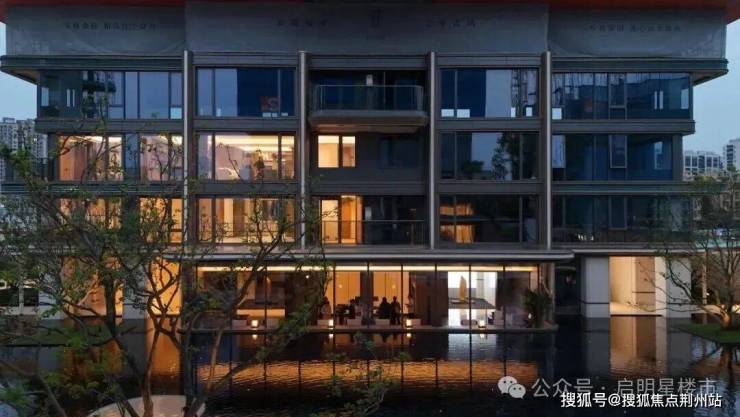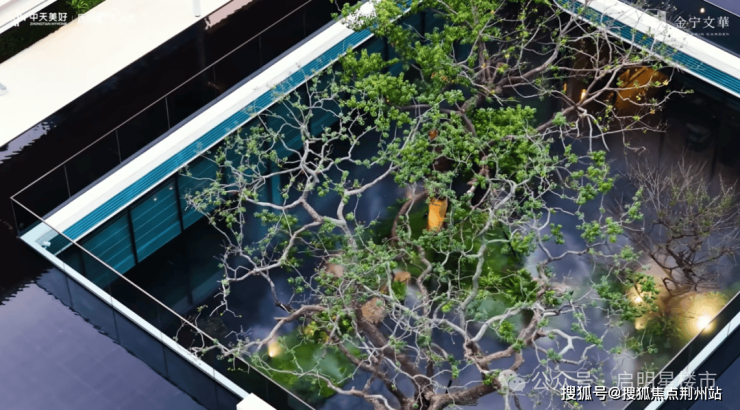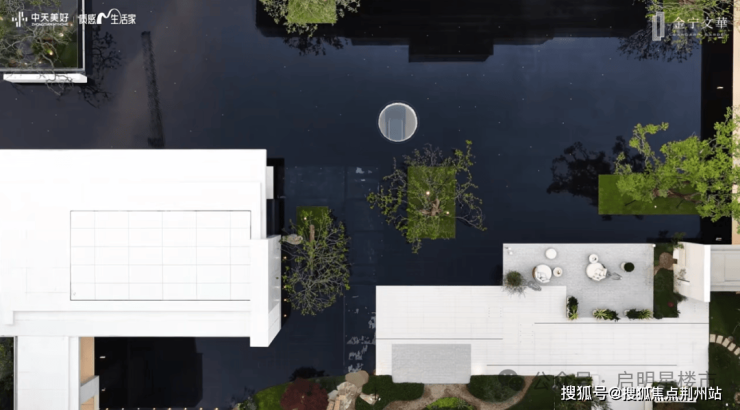 最妙的是,园中约1170㎡的四时水镜,倒影出天空、楼栋,像一幅天然的画布。水面还融入了“繁星”与“满月”的元素,圆形天井与地下光线相通,犹如天上圆月,水中灯光闪烁,恰似坠入凡间的星河。