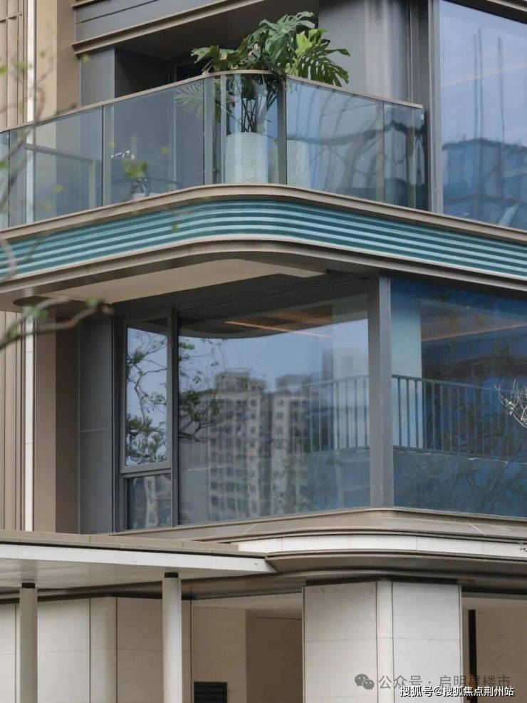 外立面上,项目选用香槟色铝板、超白LOW-E三玻两腔玻璃,装饰线条位置还嵌入白色石材,露台的底线位置装饰了碧绿色釉面陶板。