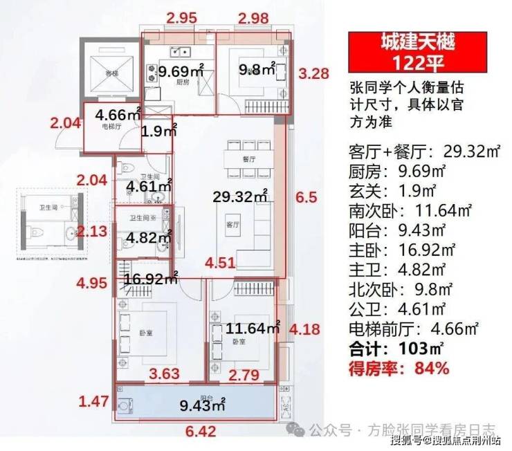 我计算了目前在售的122平边户,套内得房率84%,有独立电梯前厅,6米5面宽的竖厅设计,相对承宁府,格局强一些,得房率弱一些,有需要详细分析可1对1沟通。