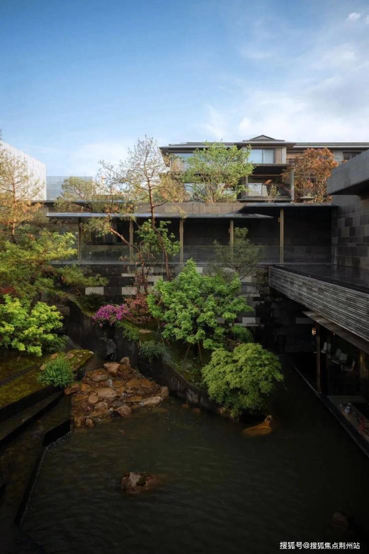 一条流动的水系串联了所有庭院的视窗,构成了在不同窗口外动态的风景,并由声音、水形态的变化,从溪到涧,聚潭成湖,汇聚到了核心庭院“莲湖”之中。