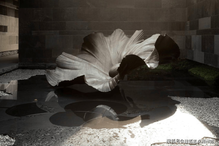 用石材的镜面质感模拟流动的水系,倒映墙外上空的绿意。以水为台的莲叶雕塑,映衬着优雅而富有生命力的画面:静静伫立,呈现清新而灵动的东方意境。