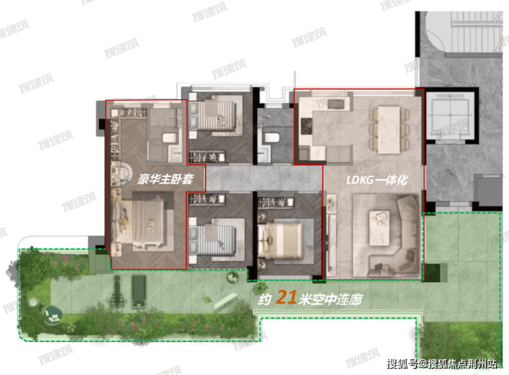 在空间功能性方面,更强调“大庭院”、“大露台”和室内核心功能区的互动。选择LDKBG一体化设计,通过均衡考量户内外居住场景,实现空间的多区域联动、场景的多元互动。