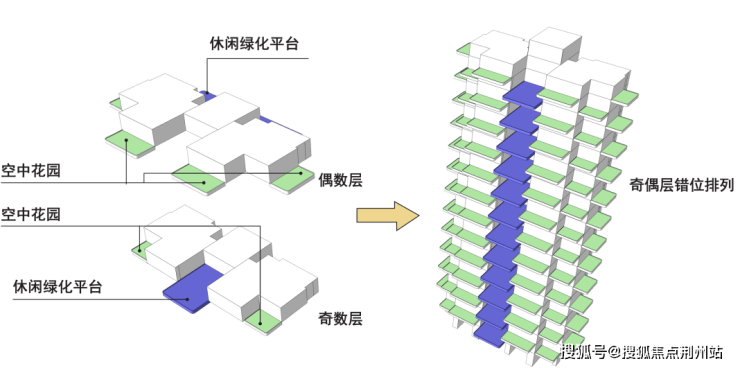 实现奇数层和偶数层的庭院位置相错,保证每一个庭院上空都有两层的挑高,总层高达到约6.2米,横向和纵向都具备舒展大尺度空间,也让更多的阳光、空气进入庭院和户内,促进植物的光合作用和生长。