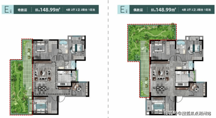 比如建面约148㎡户型和建面约147㎡户型奇偶错层布局,私密独梯入户,尽享归家礼序。户型主卧做了边厅式的设计,奇数层主卧连接超大空中花园。偶数层厨房连接着空中花园,十分便捷。双套房的配置,三代同堂也享有阔绰的空间。
