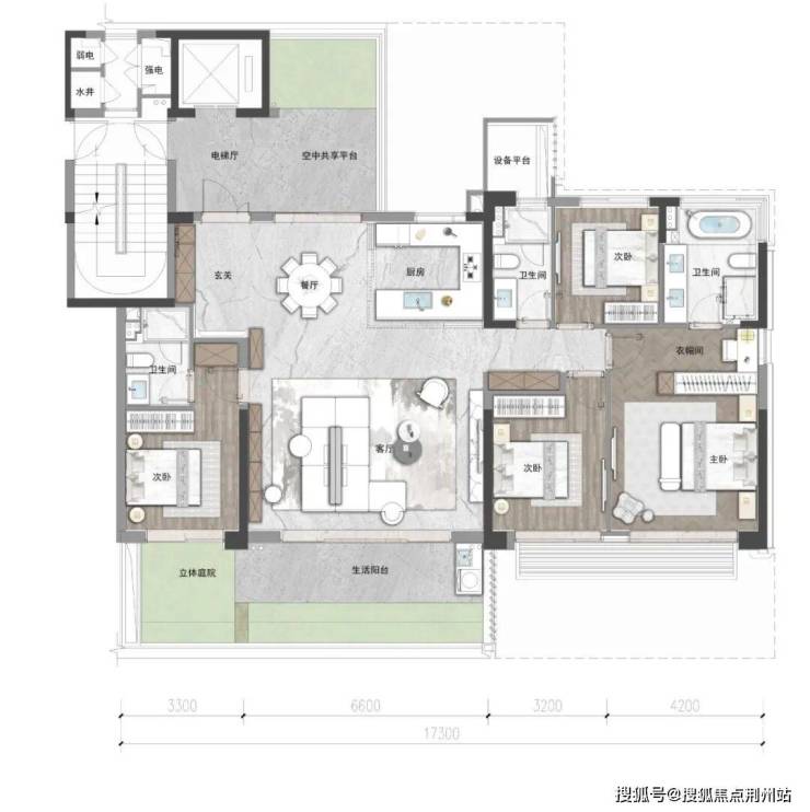 南向总面宽约17.3米,其中生活阳台约6.6米,立体庭院约7.4米,每个空间都极具尺度感。