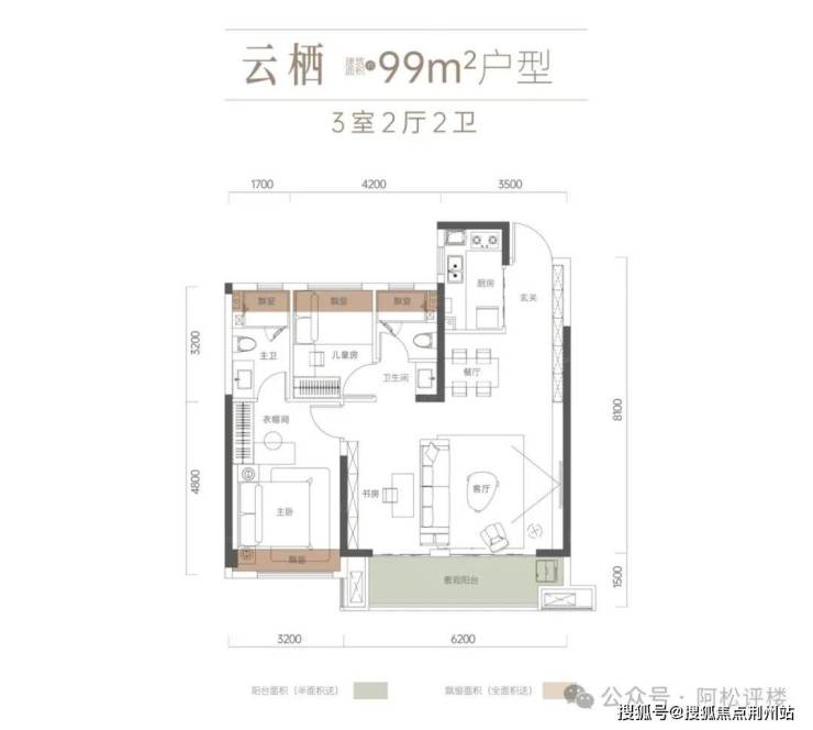 建面约98㎡ 三房两厅两卫:4号楼中间户,三开间朝南,户型方正,依靠北侧连廊实现室内通透,动静分区,南向阳台较大,飘窗优化面积多,是比较常见的连廊中间套三房。
