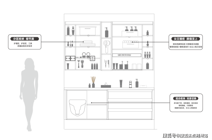 主卧卫生间的“女王镜柜”,内置可以上下移动的美妆镜、可以给刮胡刀和电动牙刷等充电的插口,以及口红等化妆品的小格篮……甚至在淋浴区预留了飘窗台面,可坐可置物,满足不同阶段的家庭需求。