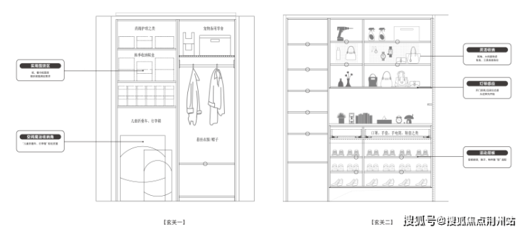 我们在这个户型的样板间看到,入户玄关采用“双玄关柜”设计,高柜可收纳30寸行李箱、婴儿车,低柜则按鞋类分区,甚至预留了雨伞、消毒湿巾的收纳抽屉;