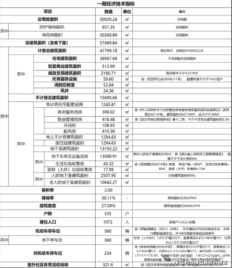 项目总建筑面积57489.84㎡,计容建筑面积41799.18㎡,住宅建筑面积38967.68㎡,容积率2.0,一共335户,机动停车位360个。