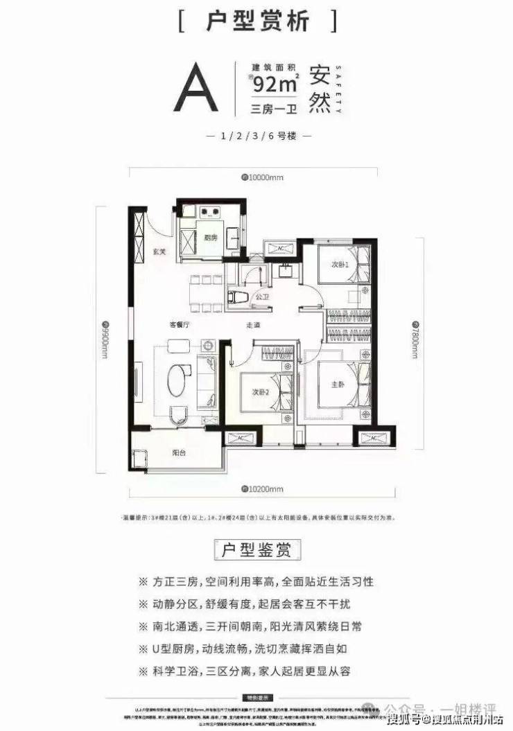 建面约92㎡户型:紧凑型三房,面积不大,传统的连廊中间套户型。
