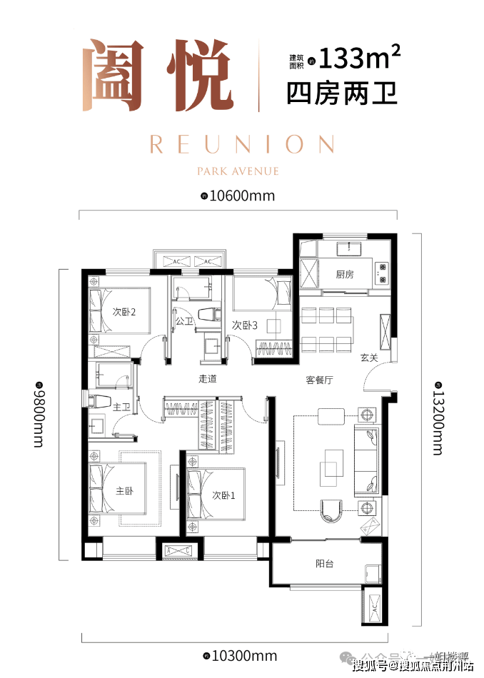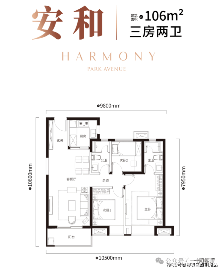 另外还有面积稍微大一点的三房和四房。其中,建面约106㎡户型是双卫的连廊中间套。