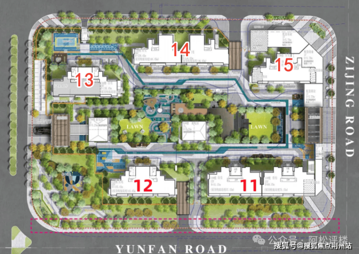 从平面图看,即将加推的13号楼位于社区西北部,南向可俯瞰社区中央园林,因为与前面楼栋错开布局,遮挡少,部分房源还有一定看湖视野。