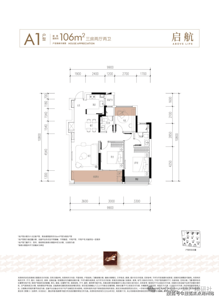 起步的建面约106方,南向开间达到约10米、封闭式阳台、客厅做了S墙,非常适合年轻夫妻或三口之家,空间尺度很舒服。