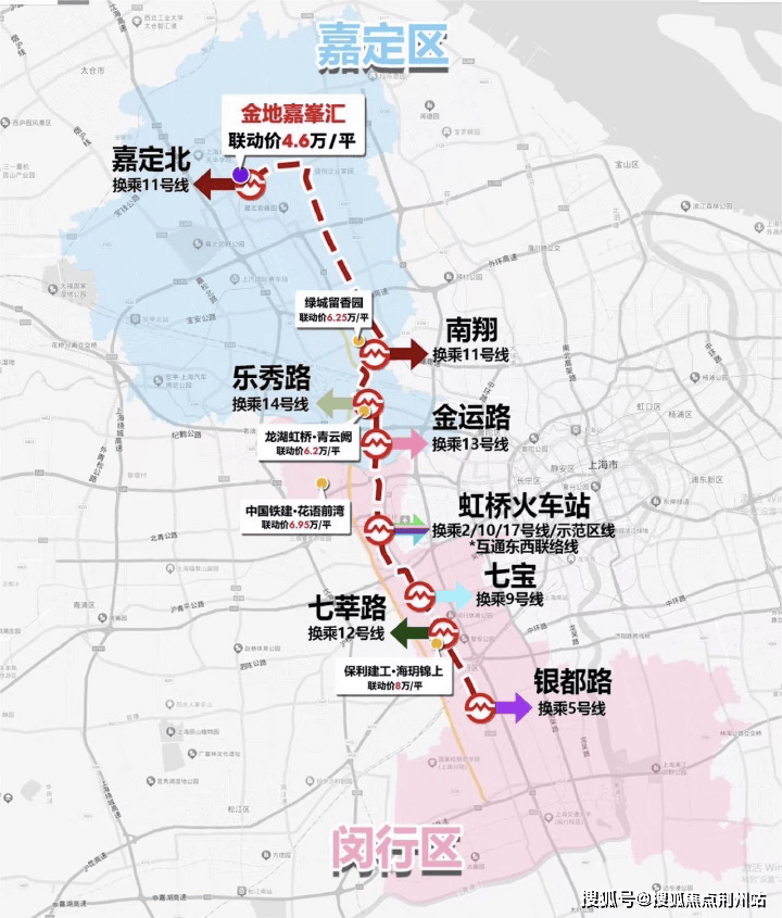 直线距离约200米嘉闵线(在建),8站直达大虹桥,连接七宝、莘庄等多个CBD,不论是上下班、聚会、商务出差等都十分便捷。另外值得一提的是沿线新盘均价均在6-8万区间,其中约350万总价的潜力盘或许只有金地嘉峯汇!