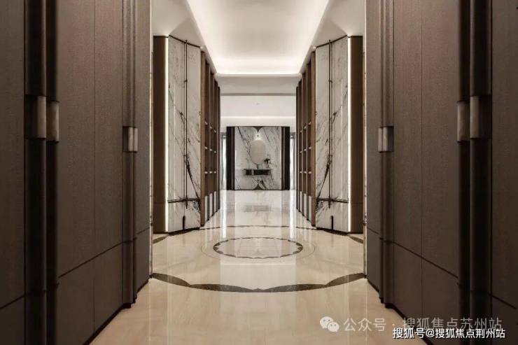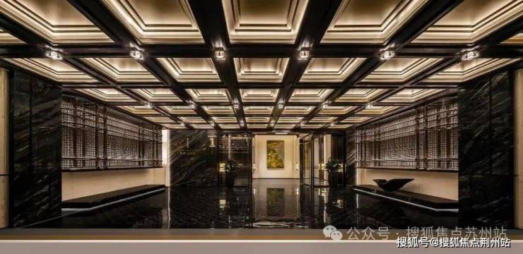 项目汲取伦敦安达仕酒店车马厅设计,地库整体重金铺装,墙面金属造型搭配南美洲苏里南黑石材,地面为精致石材拼花,融入苏州园林窗花元素。