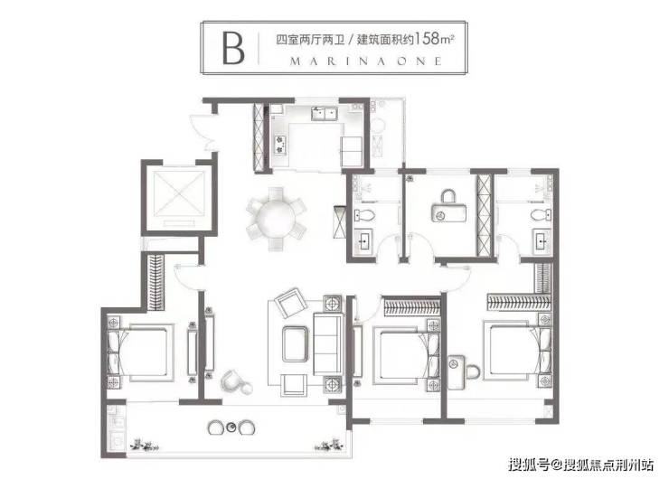 建面约158㎡中间套,南向面宽达约15.3米,四开间朝南+双开间阳台+双飘窗的设计,让每一位家人尽纳阳光与风景。