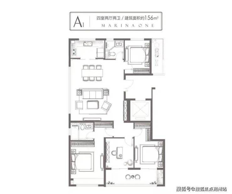 以建面约156㎡边套户型为例,四室两厅两卫格局,推门而入,超40方餐客一体大连厅豁然开朗。